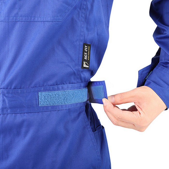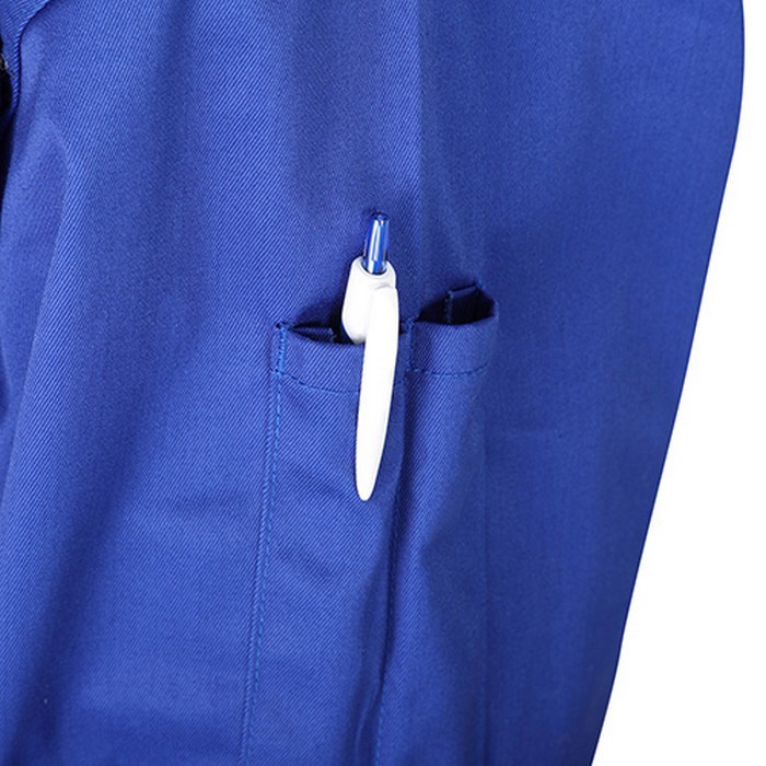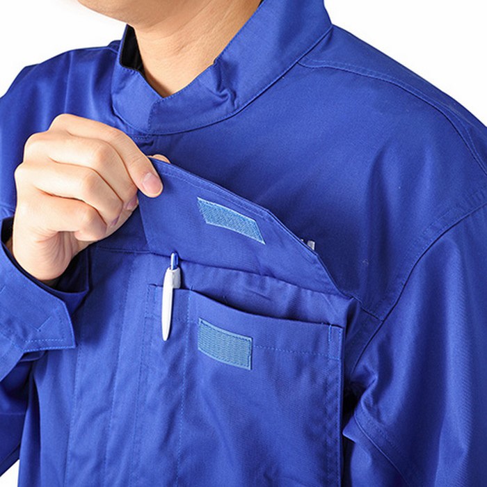 帯電防止糸を織り込んだ加工で着心地と作業性を両立し、さらにペンホルダー付きポケットを左胸と袖に装備し利便性も確保。