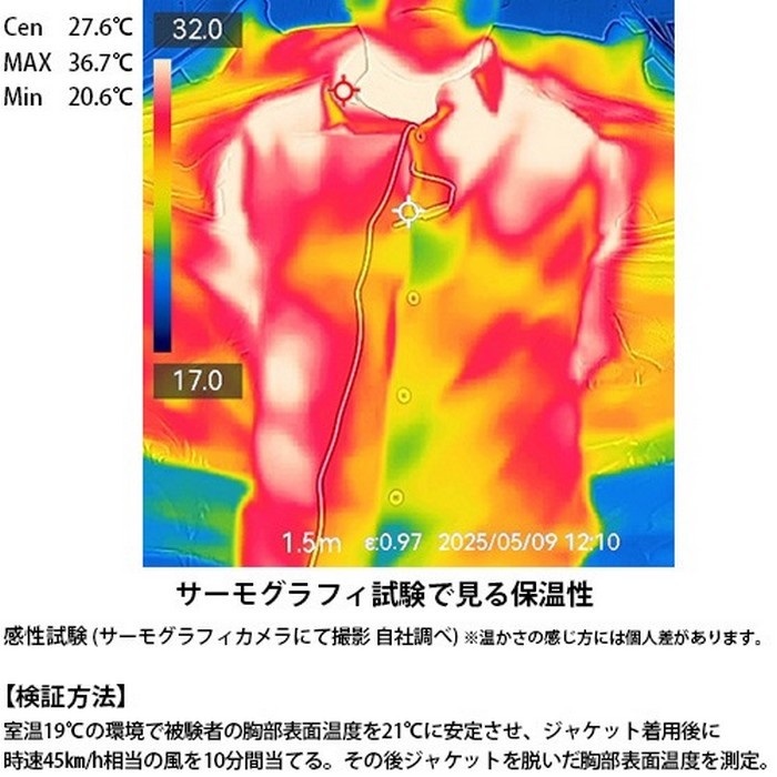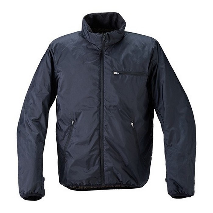 アウター・インナーともに表地、中綿、PEフィルム、熱反射保温機能をもつグラフェンシートの4層構造で高い保温性を実現。 アウターのフロントファスナーはダブル前立て構造となっており、正面からの風の侵入をブロック。