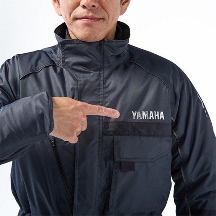 正面からの風の侵入を防ぎます。ダブルジップ仕様で細かい開閉調節可能。引き手にYAMAHAロゴ入り。