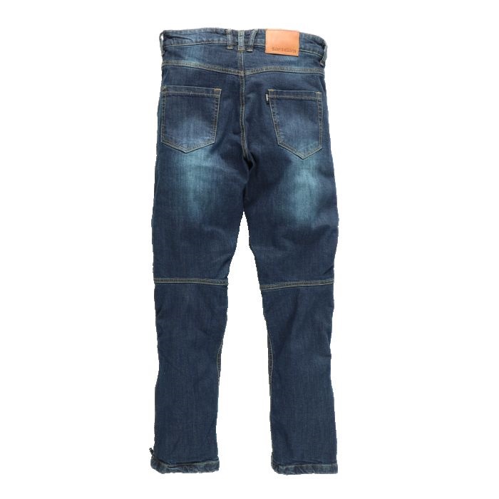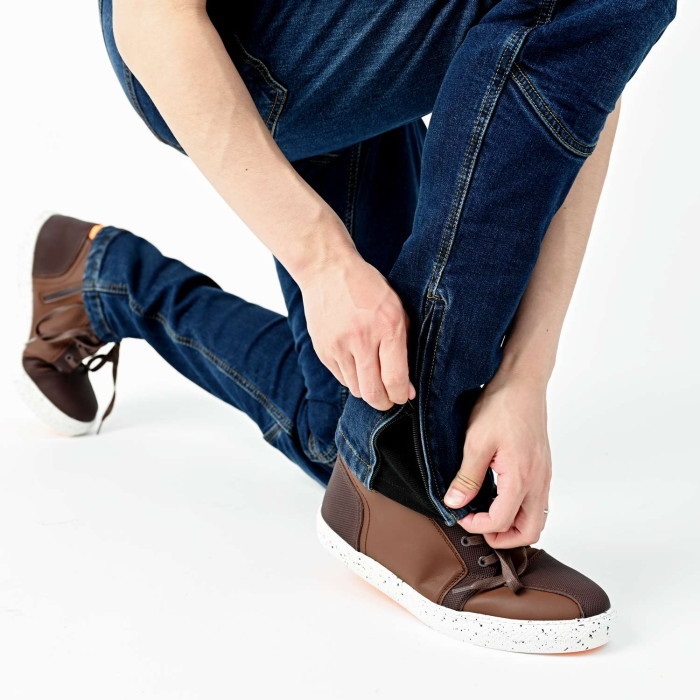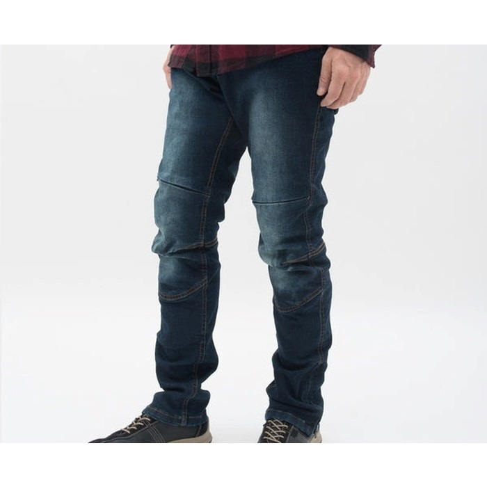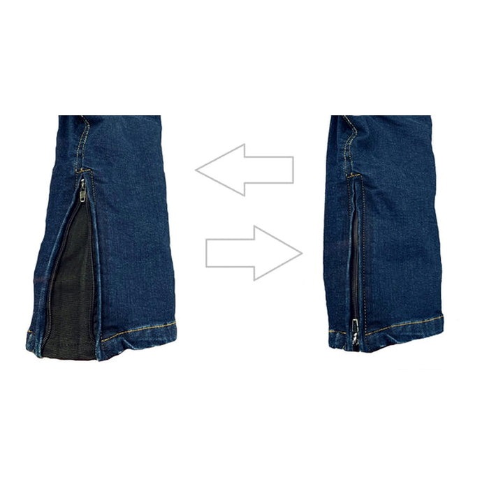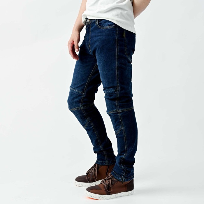 12オンスのストレッチデニムは動きやすさと耐久性のバランスが取れた厚みです。ストレッチデニムの動きやすさに加えて、立体裁断によりライディングポジションに合った形になっています。裾のファスナーは様々な形のブーツやスニーカーに合わせられます。