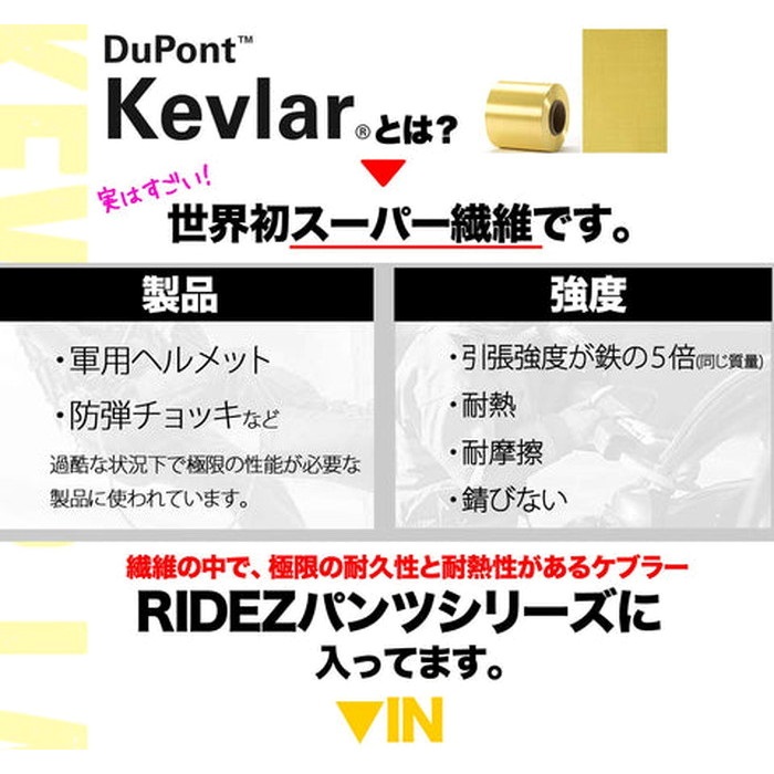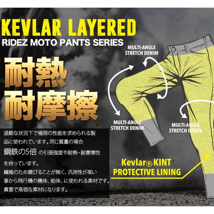 ケブラーニットのライナーは膝下まで入っており、万が一転んだ時も外傷を最小限に抑えてくれることでしょう。またケブラーニットはエンジン周辺のヒートガード的役割も果たしてくれます。腰と膝にLevel1のプロテクターが標準装備されています。