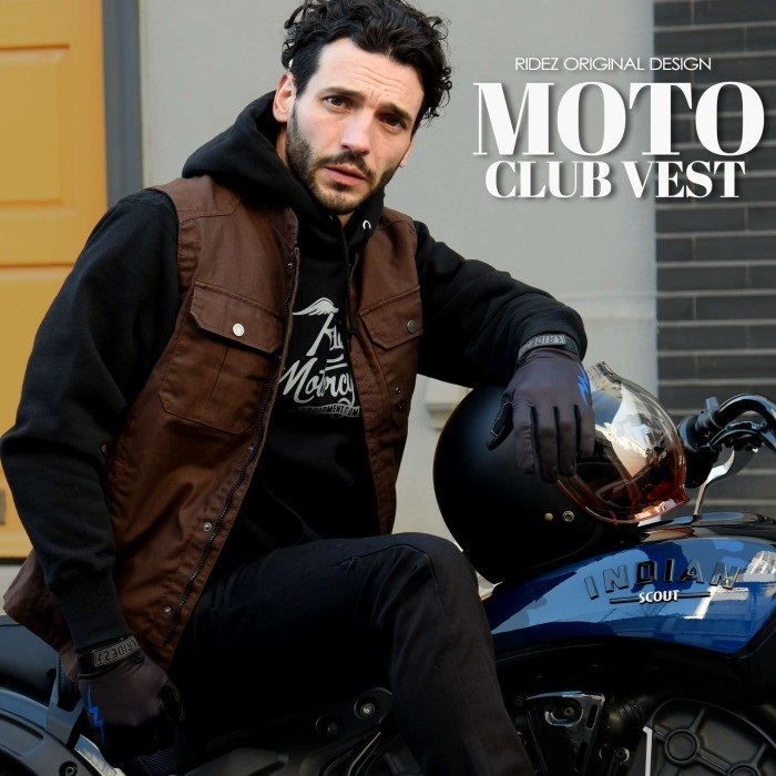 RIDEZクラブベストは、ベストにする事で、スタイリッシュに、さっと普段着の上から羽織る事ができます。バイクを降りた後も、かっこよく、おしゃれなスタイルが特徴です。胸、脊髄には、プロテクターを標準装着しながらも、綺麗なシルエットになるように、ポケットの配置や生地にこだわりました。