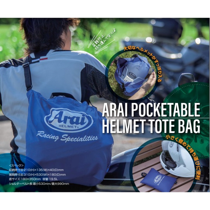 出先での急なお買い物にもエコバッグとして活躍します。教習所へ通う際にヘルメットを入れてアライヘルメットデビューも素敵です。