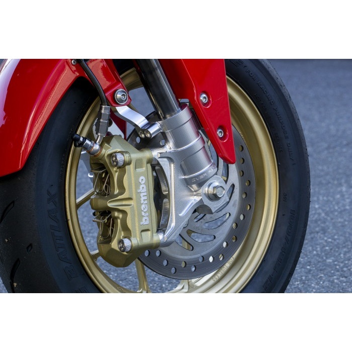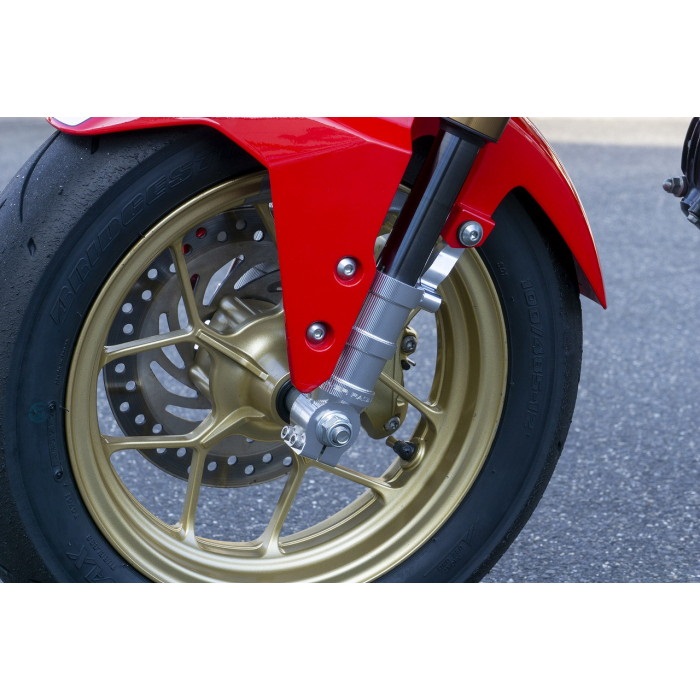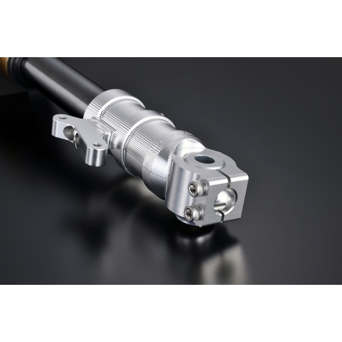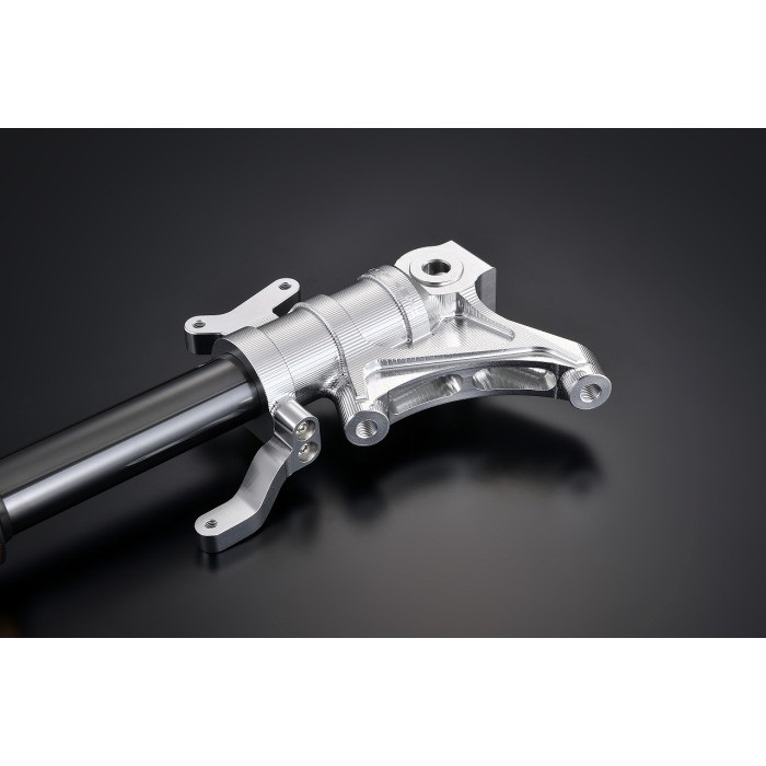ラジアルマウントキャリパー対応アルミ削り出しフォークボトムは、純正鋳造製ボトムの構造を見直し、高剛性かつキャリパー本来の性能を引き出せる、ビックバイクのボトムと見紛うほどの削り出しで独特な機能美を追求しました。