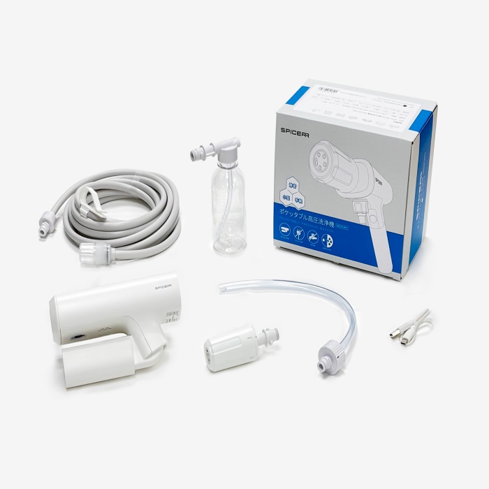 同梱物一覧 :本体×1、5in1ジェットノズル×1、洗浄タンクキット×1、給水ホース×1、ホースクリップ×1、USB Type-Cケーブル×1、ペットボトルコネクター×1