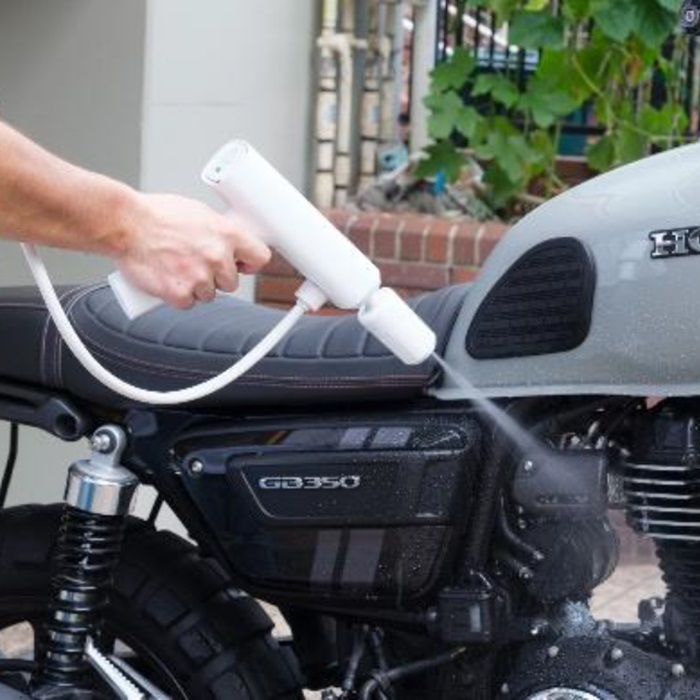充電式でコンセントとケーブルの長さなどを気にせず使用することができ、バケツからホースまたはペットボトルを装着することで水栓いらず。場所を選ばない洗浄が可能です。