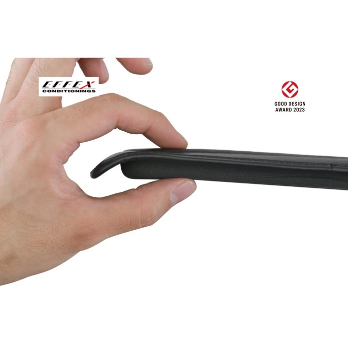 素材自身の遅延回復粘弾性により、衝撃吸収力がウレタンフォーム等に比べ5-10倍程度高く、身体にかかる負担を大幅にカットします。ウレタンフォームは衝撃を瞬間的に受け止める為のピークが出やすく、厚みがないと衝撃が貫通しそのまま身体に伝わりますが、エクスジェルは衝撃を伝わり始めた時点から素材自身で多方向に力を打ち消しながら伝えていく為、ピークが出にくく薄くても身体に伝わる衝撃を最小限に抑えます。