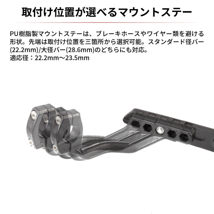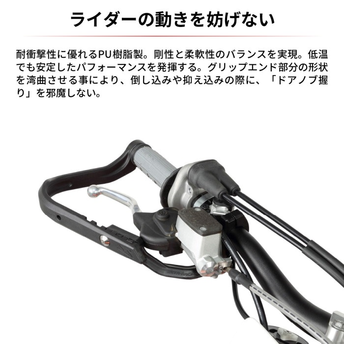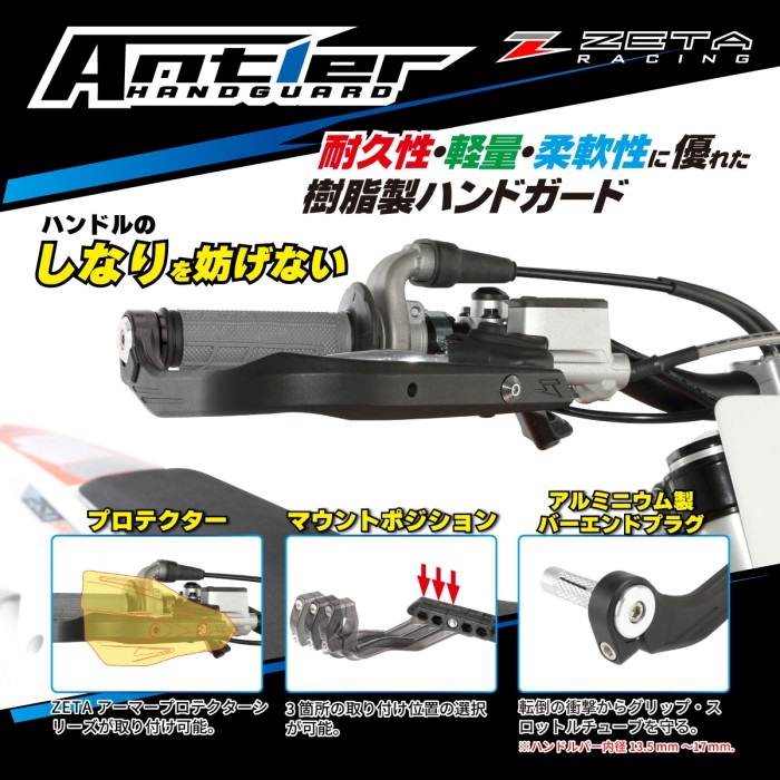 剛性と柔軟性を高次元でバランスさせた、軽量な樹脂製ハンドガード。自由度の高い操作性と細部まで軽量化したフットワークの良さ、「一般的に、瞬間的な強い衝撃に弱い樹脂製ハンドガード」を強化した、ZETA専用設計のアントラーハンドガードは、レースシーンにおいて大事な「速さと信頼性」を実現。また、確実にハンドルバーへ固定しながらも、転倒時の強い衝撃に対してガードが回転。破損や手の巻き込みなどを軽減する。