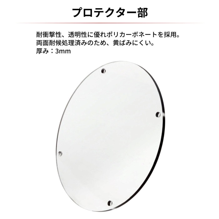 頑丈なアルミ製フレームと、照射を妨げないポリカーボネート製プロテクターによるハイブリッド構造のヘッドライトガード。
