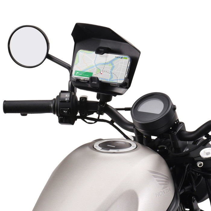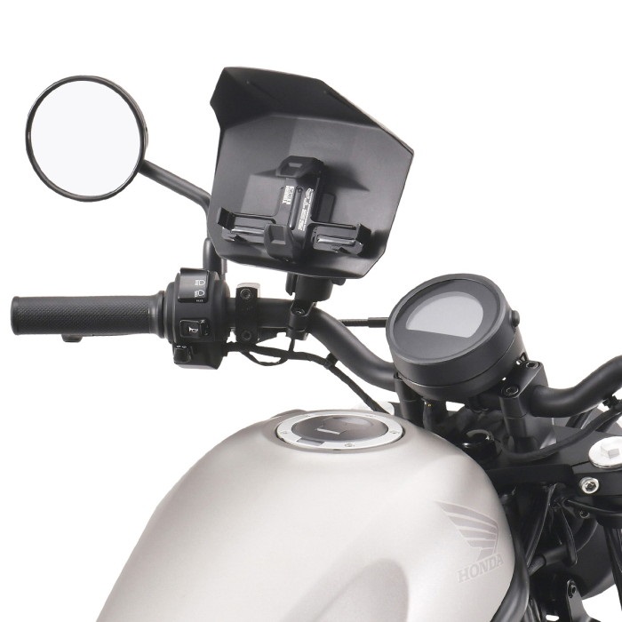 高精度を追求しCNC加工を採用したスマートフォンマウント”タフロック”と、走行中の飛来物からスマートフォンを守るシールドのセット。