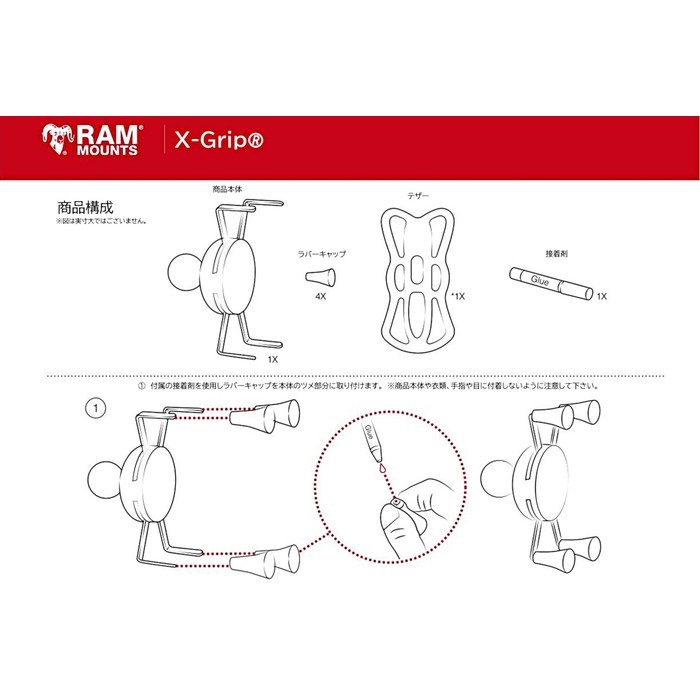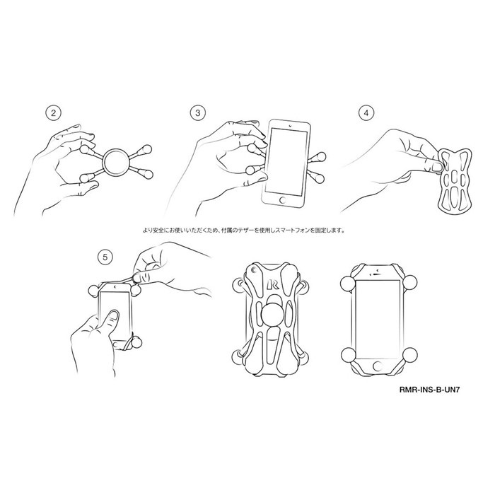 Xグリップのゴムパーツで対象物をしっかりと挟み、テザー(ゴムバンド)でその上から固定することによって、よりしっかりとホールド出来ます。