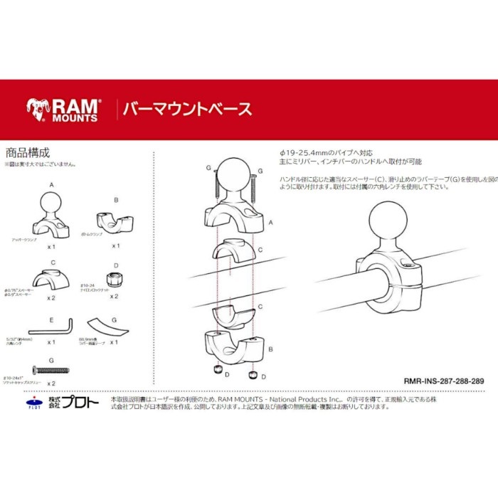 バーマウントベースは付属のボルトナット、工具を使うことで簡単に取り付けが可能で、対応するパイプ径へ確実に固定することができます。Mサイズではφ19.05-25.4mmのパイプへ取り付け可能で、主にオートバイの22.2mmハンドル(ミリバー)や25.4mmハンドル(インチバー)への取り付けに最適です。