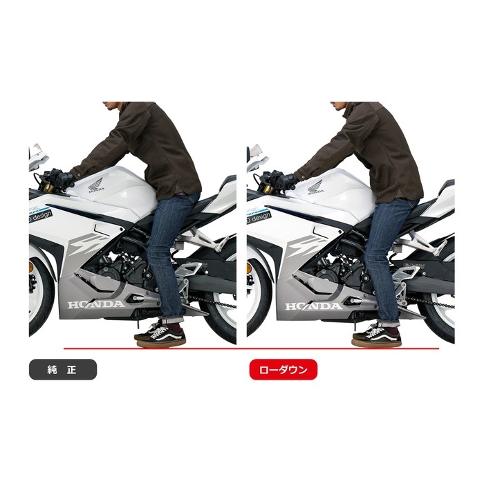 ローダウンキット(PHA0030D)とショートサイドスタンド(PHS0030)のセット品番。ローダウンキットはベアリング内蔵コの字タイプ 調整機能無 シート高20mmダウン。