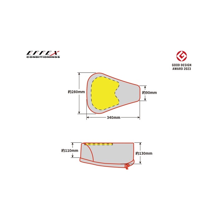 サイズ:340(長さ)×90(前幅)×280(後幅)/高さ110(前)×130(後ろ)mm、座面部位厚さ:15mm