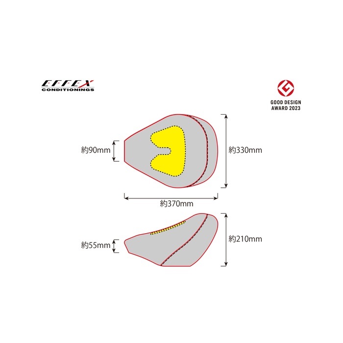重量:330g サイズ:370(長さ)×90(前幅)×330(後幅)/高さ55(前)×210(後ろ)mm 座面部位厚さ:17mm