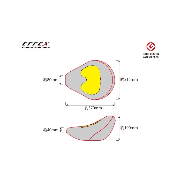 重量:360g サイズ:370(長さ)×80(前幅)×315(後幅)/高さ40(前)×190(後ろ)mm 座面部位厚さ:17mm