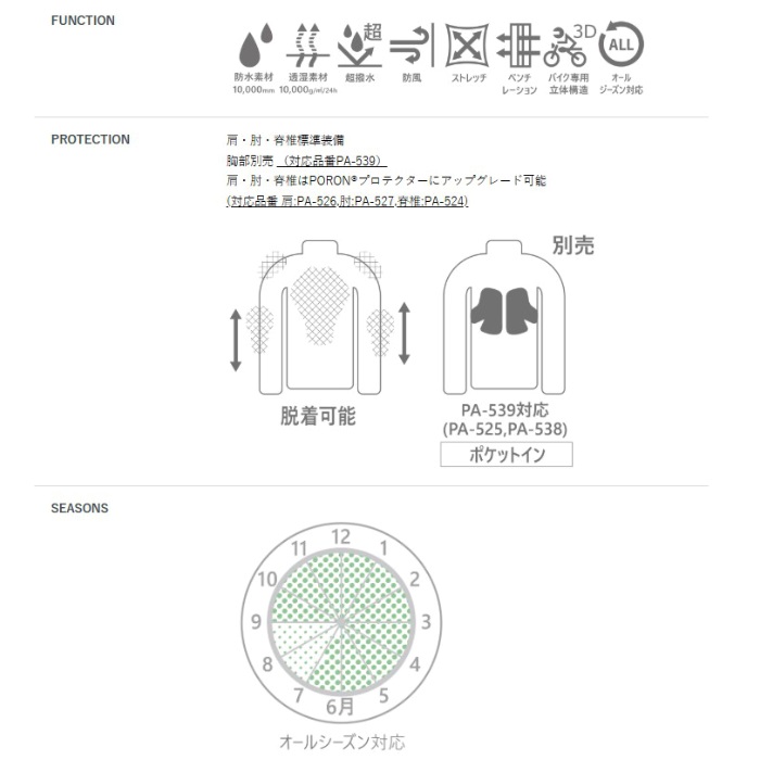 起毛素材を使用した「脱着式ウインドストッパーインナー」と、後脇のベンチレーションを利用すれば、寒い時期からあたたかい時期までのオールシーズンに対応します。バイク用立体構造で運動性も抜群。機能性とデザイン性を備えました。春・秋・冬、晴れ・風・雨、季節と天候を楽しむ一着です。