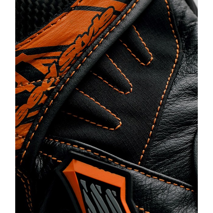 甲側に配置したカーボンナックルプロテクターが特徴となるこのグローブ。掌側には衝撃を滑らせて分散させるXEINスライダーを装備し、安全性を高めています。もちろん操作性にもこだわり、可動部には伸縮性に優れた防風ストレッチ素材とカウハイドをクロスオーバーして使用しています。