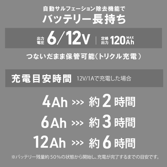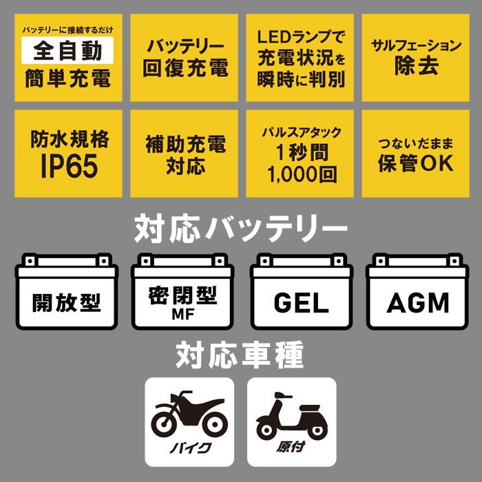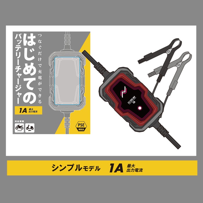 ツーリング前の愛車メンテナンスに欠かせない、バイク専用バッテリー充電器。コンパクトながら高性能で、長期間乗らないときの電圧低下やバッテリー上がりをしっかり防止します。バッテリーにクリップで接続するだけの簡単、安全設計だから初心者でも安心。サルフェーション除去機能を搭載し、バッテリーを常にベストコンディションにキープできます。1A充電の「シンプル」タイプ。