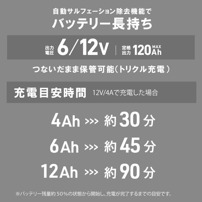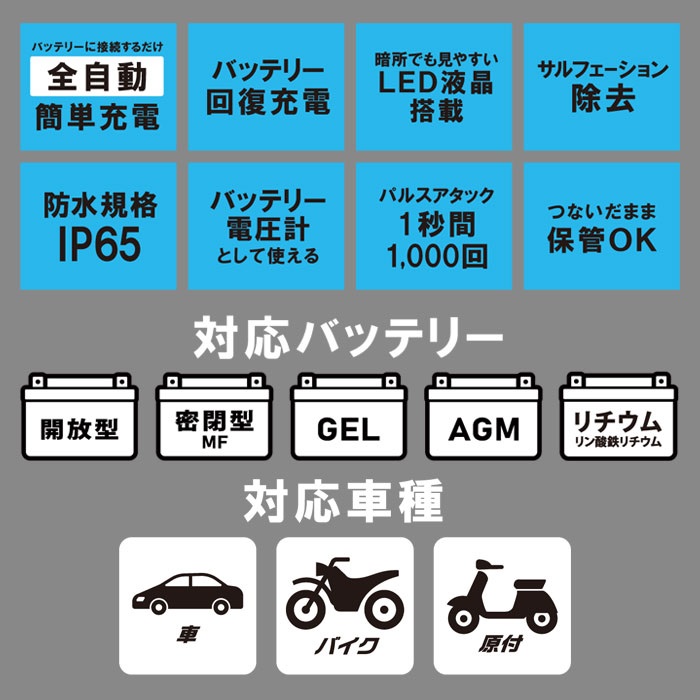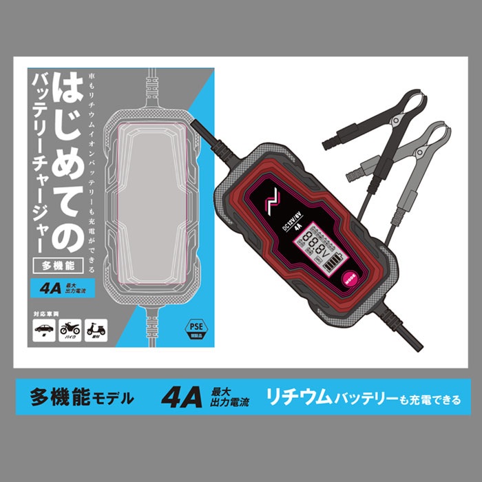 ツーリング前の愛車メンテナンスに欠かせない、バイク専用バッテリー充電器。コンパクトながら高性能で、長期間乗らないときの電圧低下やバッテリー上がりをしっかり防止します。バッテリーにクリップで接続するだけの簡単、安全設計だから初心者でも安心。サルフェーション除去機能を搭載し、バッテリーを常にベストコンディションにキープできます。4A充電・リチウムバッテリー対応の「高機能」タイプ。