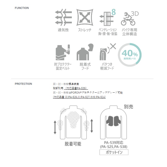 ◆ベンチレーション装備で幅広い季節に対応(胸、腰、袖、後脇)