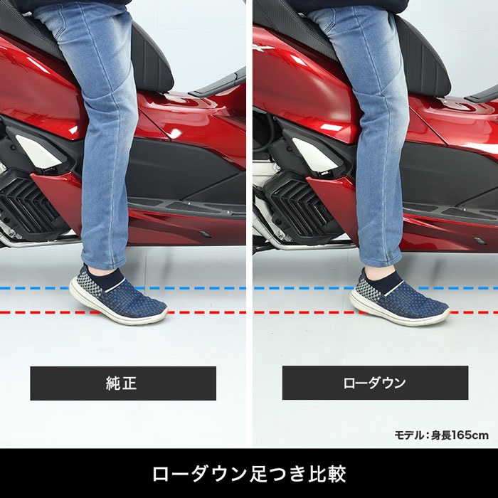 純正に比べてシート高が約35mm下がることで乗車時の足つき性が向上し、信号待ちや、特にタンデムの停車時での安心感が増します。