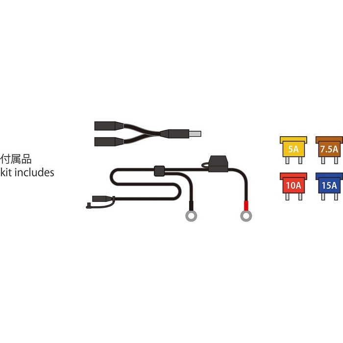 電源取り出し用ハーネスと4種のヒューズ(5A/7.5A/10A/15A)が付属。