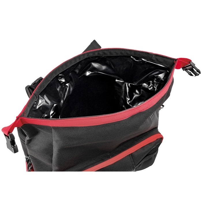 縫い目のない溶着PVCライナーを備える防水仕様のメイン気室と、スマホ等、よく使用する物を取り出しやすいジッパーポケット(非防水)を装備した使い勝手のよいバッグ。