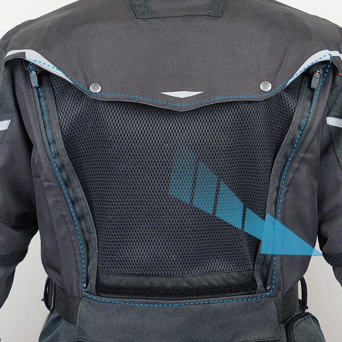 防水・防風・透湿性等に優れた素材を採用、すべてのテクノロジーを投入した一着です。 様々な状況下で安定したコンディションをキープし、ショートトリップからロングツーリング、そしてハイスピード・ライディングと多様なステージまで幅広く対応。また、防寒対策として着脱式インナージャケットを装備。酷暑の夏に対応できるベンチレーション機能は、長年培ったノウハウを惜しみなく投入しました、胸部、フロントVベント、アーム部からの外気のエアインテークを大型バックベンチレーションパネルより効率的に排気し、驚くほど効果的に衣服内環境を最適な環境に保ちます。