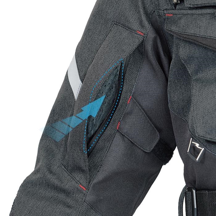 防水・防風・透湿性等に優れた素材を採用、すべてのテクノロジーを投入した一着です。 様々な状況下で安定したコンディションをキープし、ショートトリップからロングツーリング、そしてハイスピード・ライディングと多様なステージまで幅広く対応。また、防寒対策として着脱式インナージャケットを装備。酷暑の夏に対応できるベンチレーション機能は、長年培ったノウハウを惜しみなく投入しました、胸部、フロントVベント、アーム部からの外気のエアインテークを大型バックベンチレーションパネルより効率的に排気し、驚くほど効果的に衣服内環境を最適な環境に保ちます。
