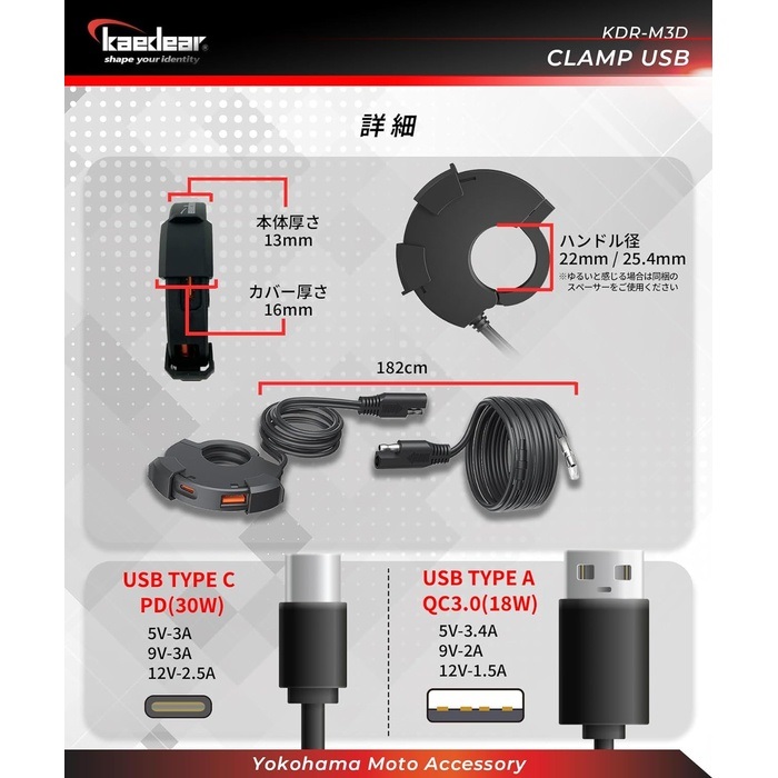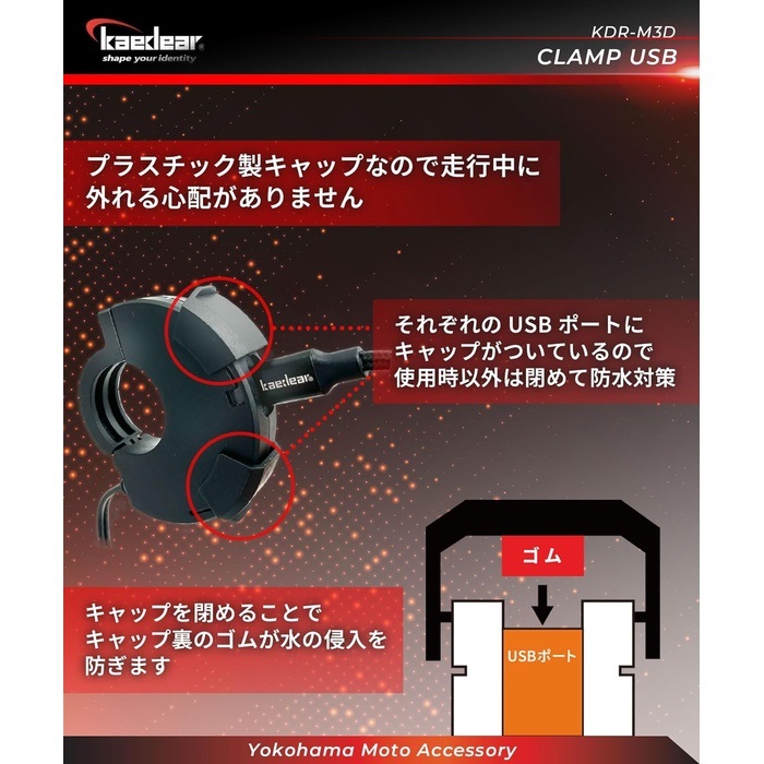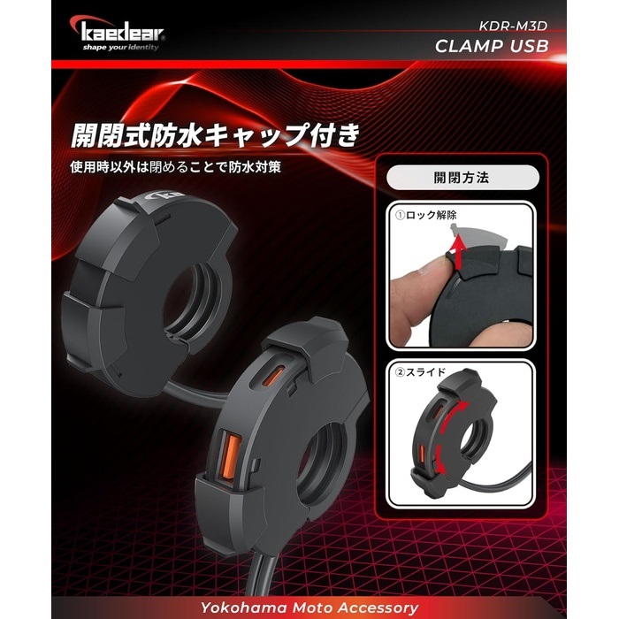 スイッチボックスのようなデザイン性の薄型の本体は、バイク純正本来の良さを活かしたいライダーに向けて設計。ハンドル周りをスッキリしたままUSB電源を設置できます。ハンドル径22mm/25.4mmに対応。(クランプバーは全て標準22mm)