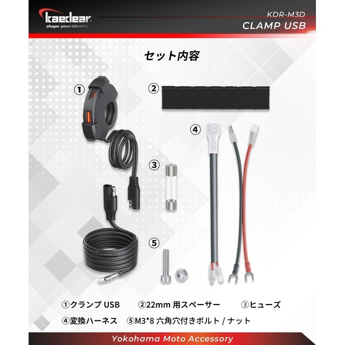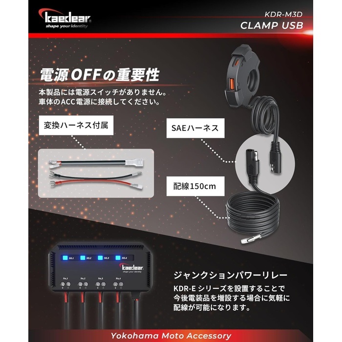 配線はKaedear充電スマホホルダーでもお馴染みのSAEコネクター付き。SAEハーネスは付属の変換ケーブルでギボシからクワガタもしくは平型分岐に変換できます。外したいときは車両に配線を残したまま、SAEコネクターを抜くだけで取り外できます。※スイッチレスのため、必ずアクセサリー電源に接続してください。ジャンクションパワーリレーKDR-E1をご検討ください。