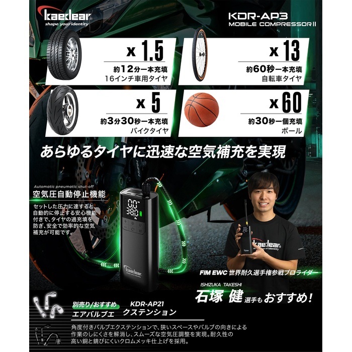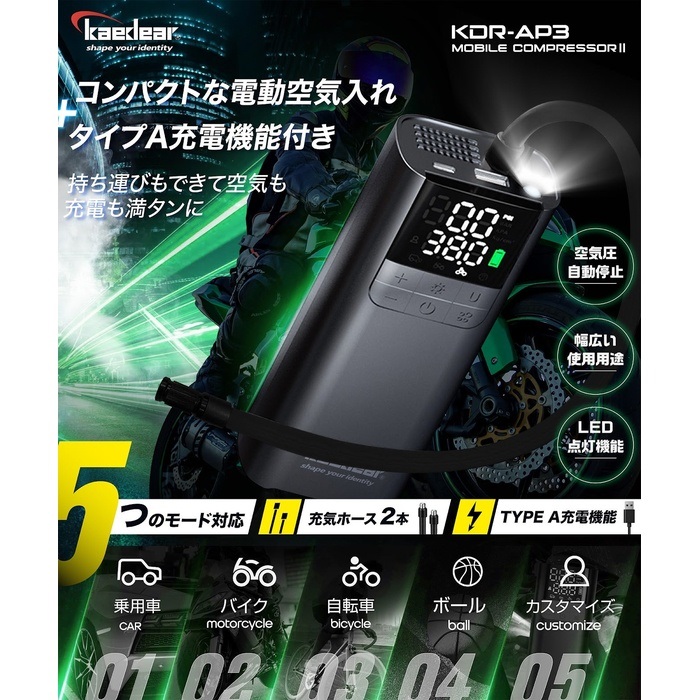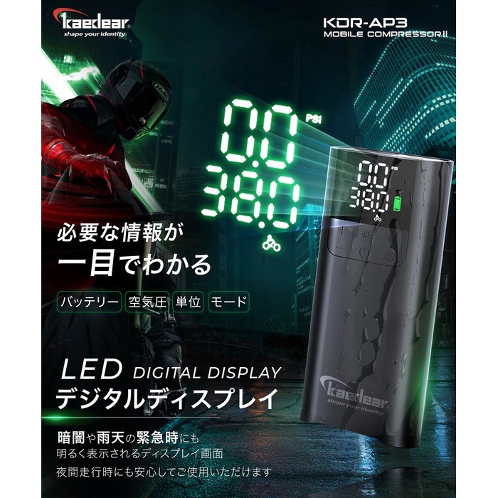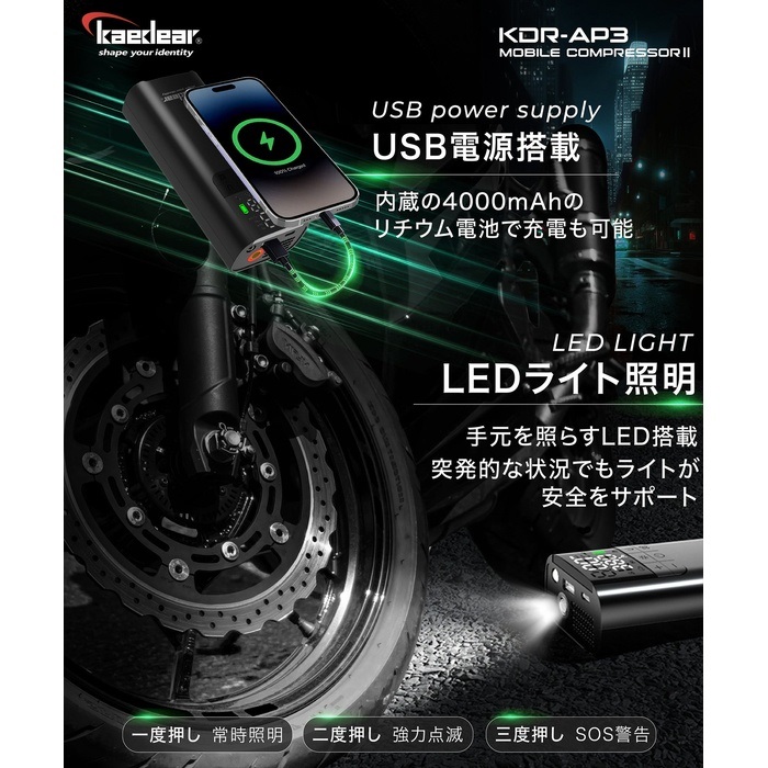 空気圧調整が自宅やツーリング先で手軽に行える充電式電動エアーポンプ。バイク以外にも車のタイヤの空気圧調整や自転車の空気入れとしてもご使用頂けます。物理ボタンは作業中にグローブをしたまま空気圧調整が可能。指定した空気圧まで自動的に充填します。