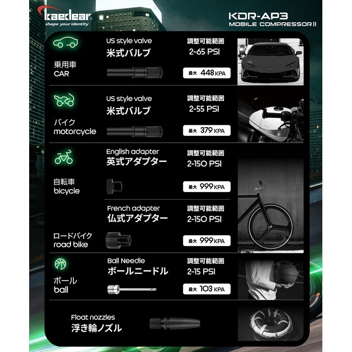 ■商品内容:モバイルコンプレッサー、エアーホース30cm×1本、15cm×1本(米式バルブ)、仏式バルブアダプター、英式バルブアダプター、ボールニードル、浮き輪ノズル、充電ケーブル、収納袋、取り扱い説明書