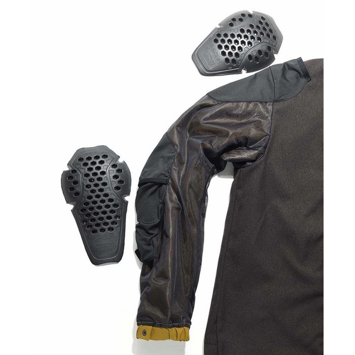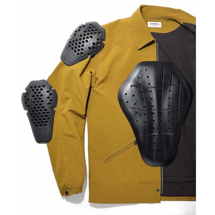 表生地には光沢感のないシックな質感と、しっとりとした質感のポリエステルストレッチ生地を採用し、ライトで普段でも使いやすい。裏地側には肩・肘・脊椎パッド袋を装備し、任意に安全性を高められる仕様。