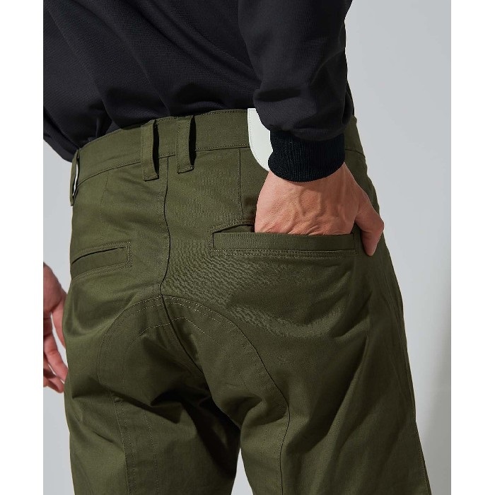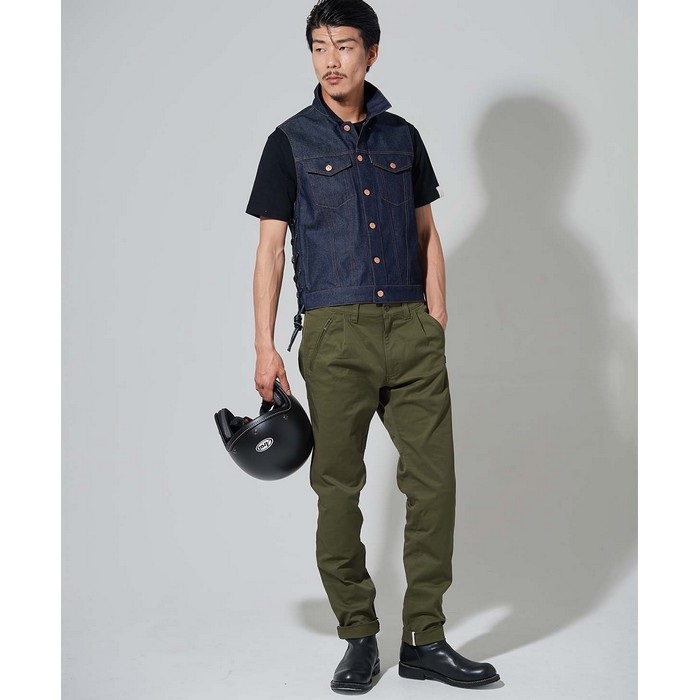 少々ゆとりのある腰回りからテーパードされたカッティングがリラックスした雰囲気とスマートなシルエットを両立させています。ナチュラルなスタイルで使い勝手が良く、ライディングシーンから普段使いまで様々なシーン活躍するアイテムです。