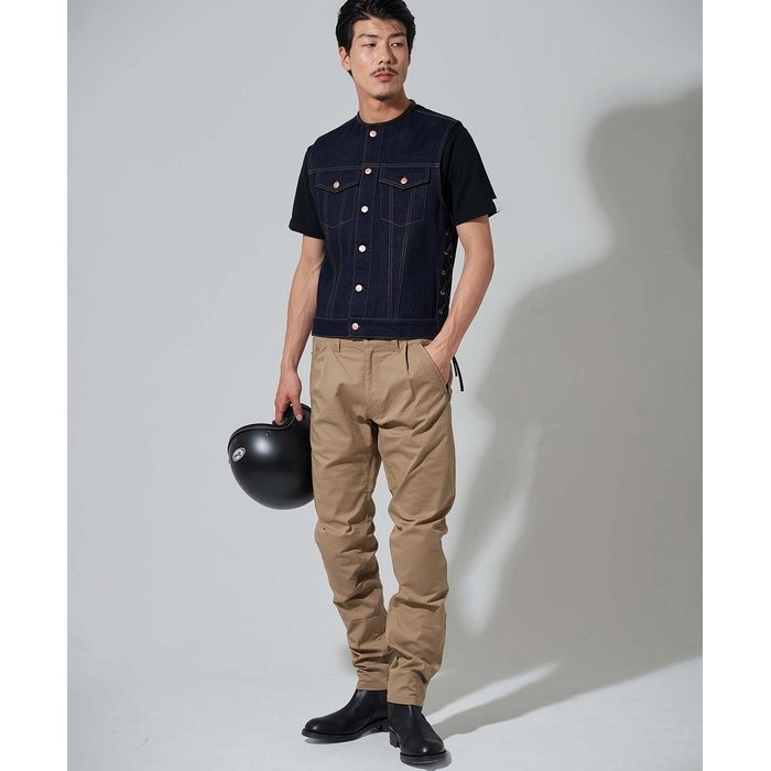 少々ゆとりのある腰回りからテーパードされたカッティングがリラックスした雰囲気とスマートなシルエットを両立させています。ナチュラルなスタイルで使い勝手が良く、ライディングシーンから普段使いまで様々なシーン活躍するアイテムです。