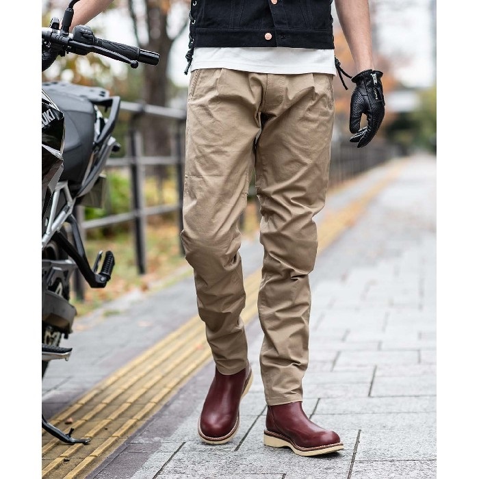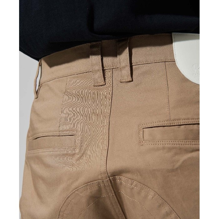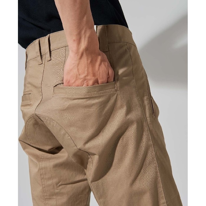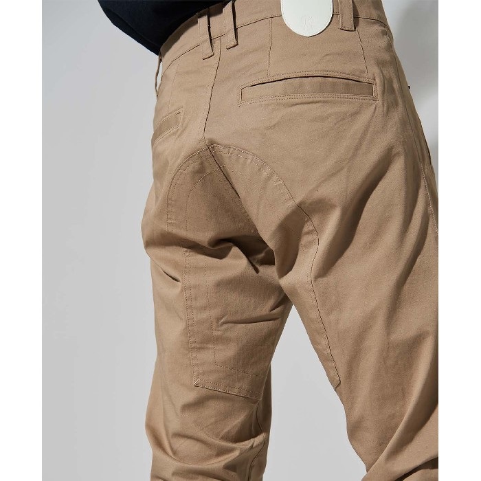 コーデュラ×コットンのストレッチ素材を使用することで耐久性と風合いを兼ね備えたライディングチノパンツです。