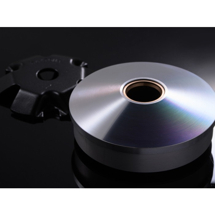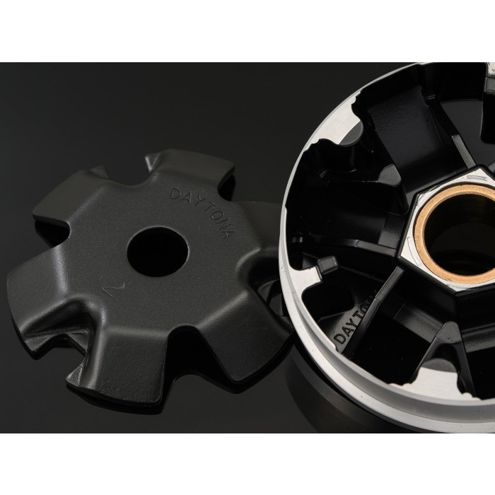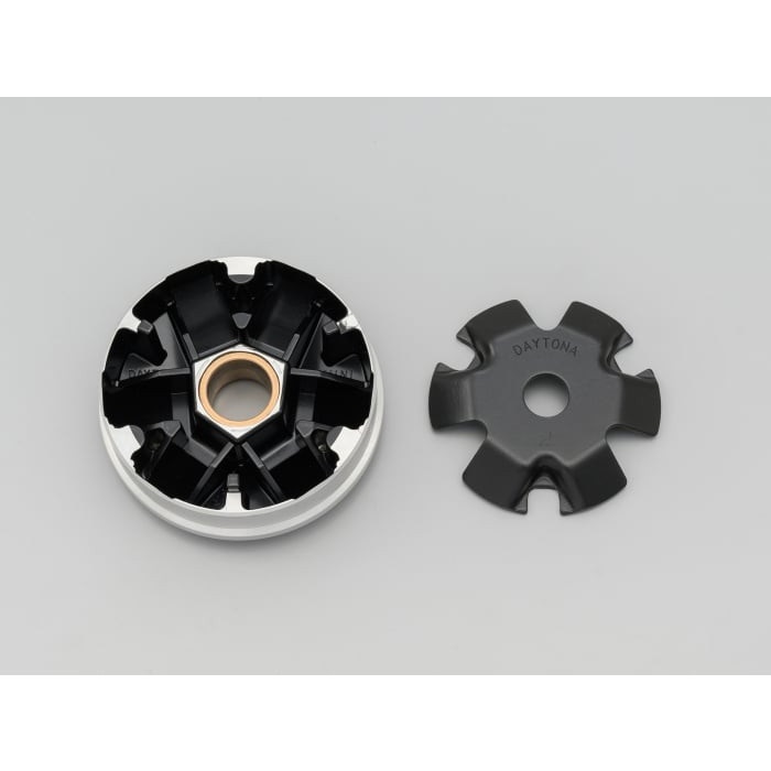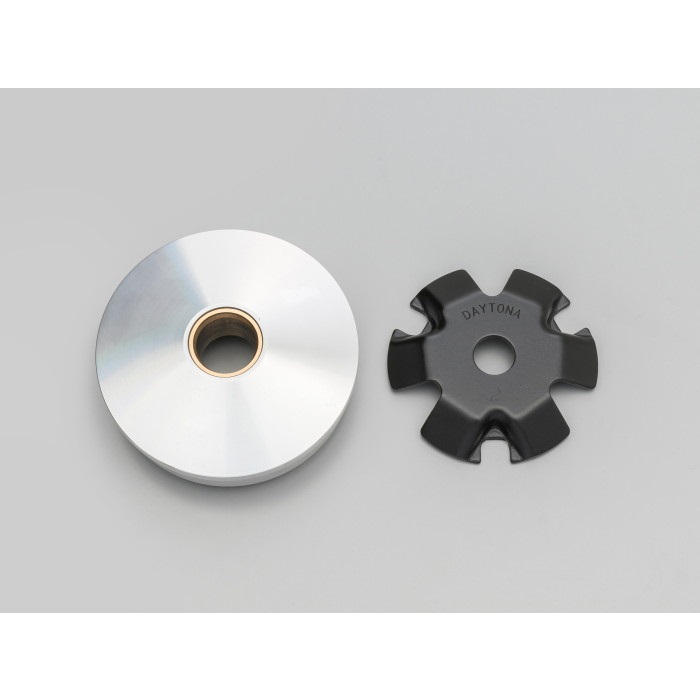 プーリー本体+専用ランププレートのセット。ランププレート内側のウエイトローラー移動角度、傾斜位置を各車種専用に独自設計し、ノーマルのランププレートでは実現できなかったVベルト限界まで最高速を上昇させ、同時に低速度域での鋭い立ち上がり加速をも実現しました。本体ローラー溝部はフッ素コーティング仕上げ。