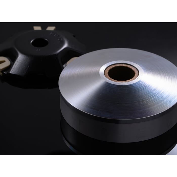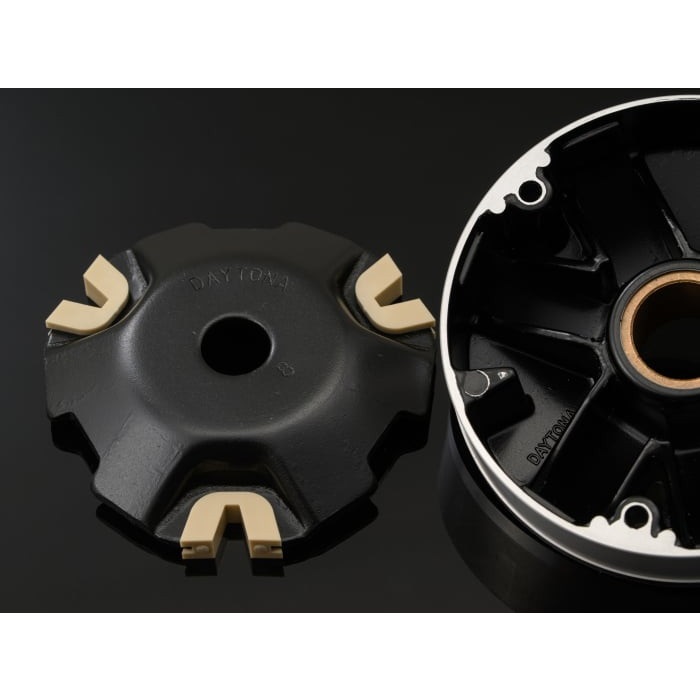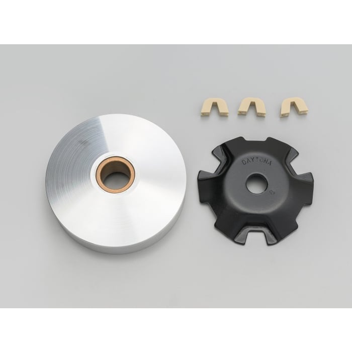 プーリー本体+専用ランププレートのセット。ランププレート内側のウエイトローラー移動角度、傾斜位置を各車種専用に独自設計し、ノーマルのランププレートでは実現できなかったVベルト限界まで最高速を上昇させ、同時に低速度域での鋭い立ち上がり加速をも実現しました。本体ローラー溝部はフッ素コーティング仕上げ。