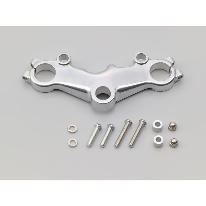 クラシック風のヌメリ感を強調した、レーサータイプのトップブリッジ。デイトナ社ハンドルストッパー(26157)使用時もハンドルロックが可能なキーシリンダーオフセットタイプ。セパハン仕様のSRを合法的にお楽しみいただくための必須アイテムです。純正トップボルト&ナットを使用。