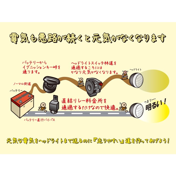 電気抵抗を減らすことで、効率アップを図りノーマルバルブのままで明るさを約26%アップさせるリレーハーネス。