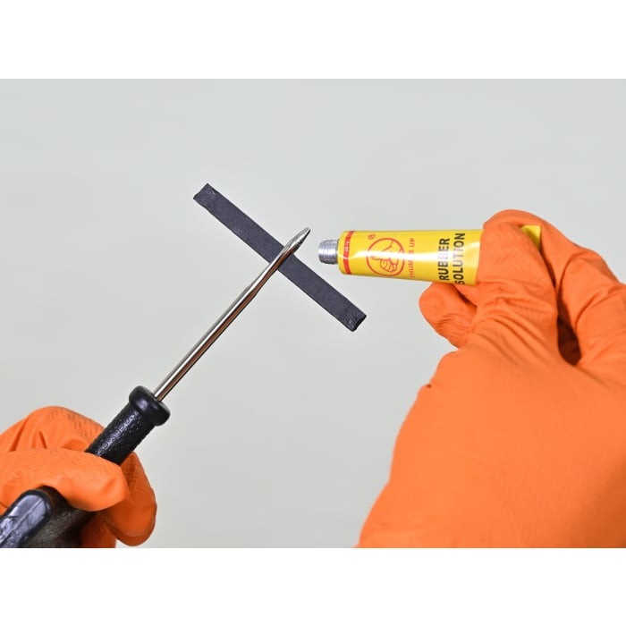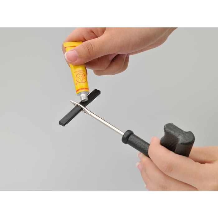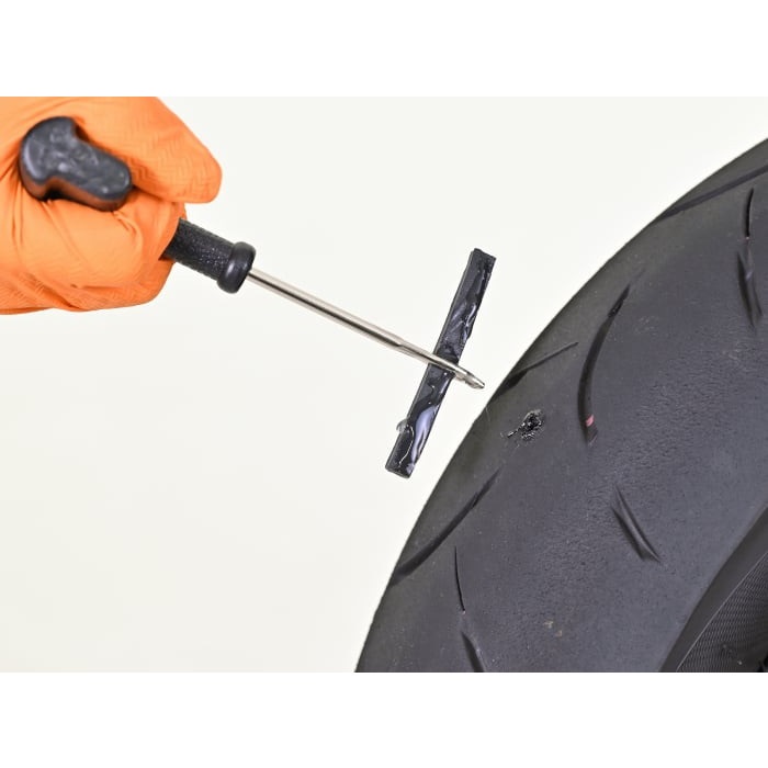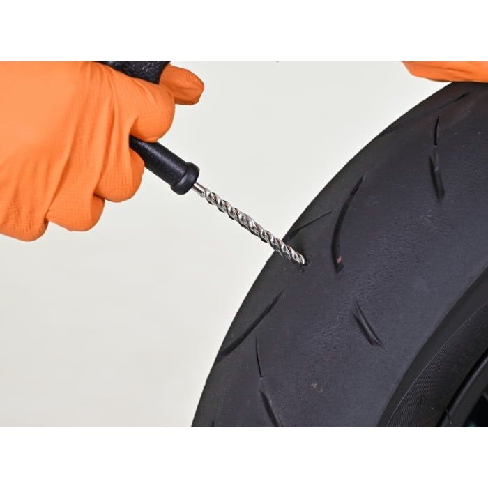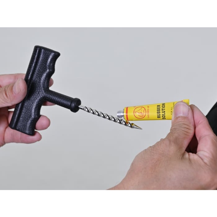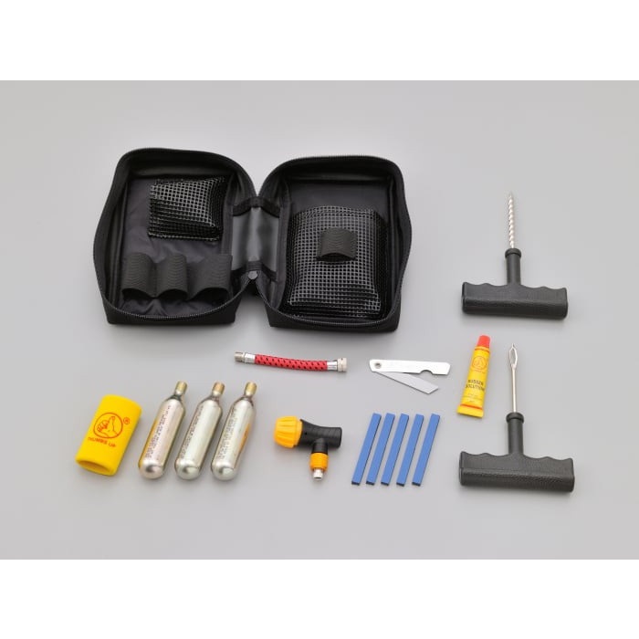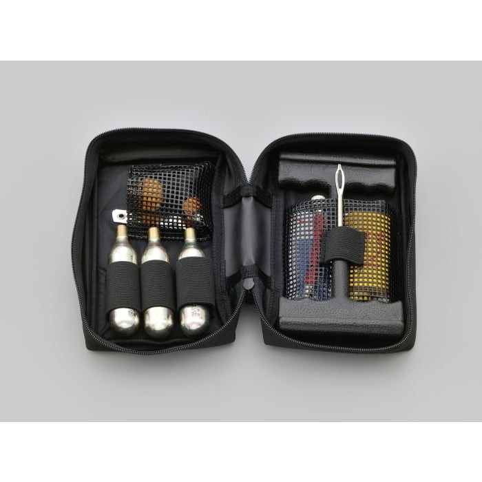 チューブレスタイヤ専用の持ち運びやすいコンパクトサイズの収納ケース付きパンク修理キット。エアボンベ3本付属で、ツーリング先での応急処置が可能。