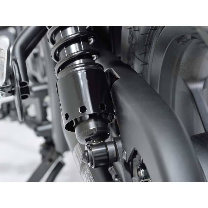 ローダウンしながらもストロークを約40mm確保。不等ピッチスプリング採用で、スタイルと乗り心地を両立。乗り心地を保ちながら足付き性が向上。最大荷重を確保し2人乗りにも対応。クロームメッキとブラックの2色をラインアップ。