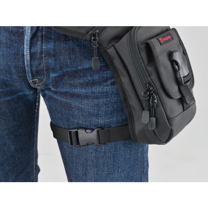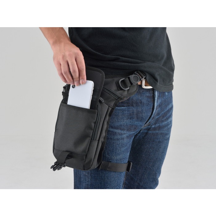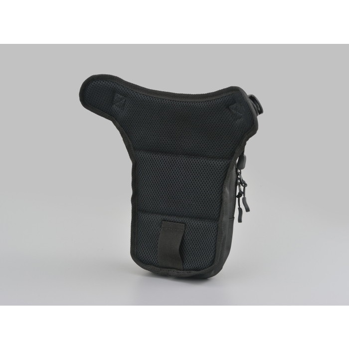 身の周りのものをすっきり身に付けられるホルスタータイプのバッグ。小物収納のほか、長財布がすっぽり入る長物収納、スマートフォンが入るフラップ収納の3室構造。フロント面のフラップ収納部分はワンタッチ開閉できるバックル式。回転式バックルとバタつき防止用のサポートベルトで装着時の密着性を高めました。また、裏側は通気性に優れるメッシュ仕様でストレスの少ない装着感を実現。素材はどんなウエアにも似合うポリエステル。