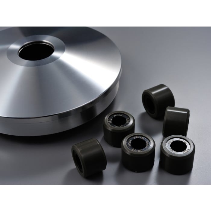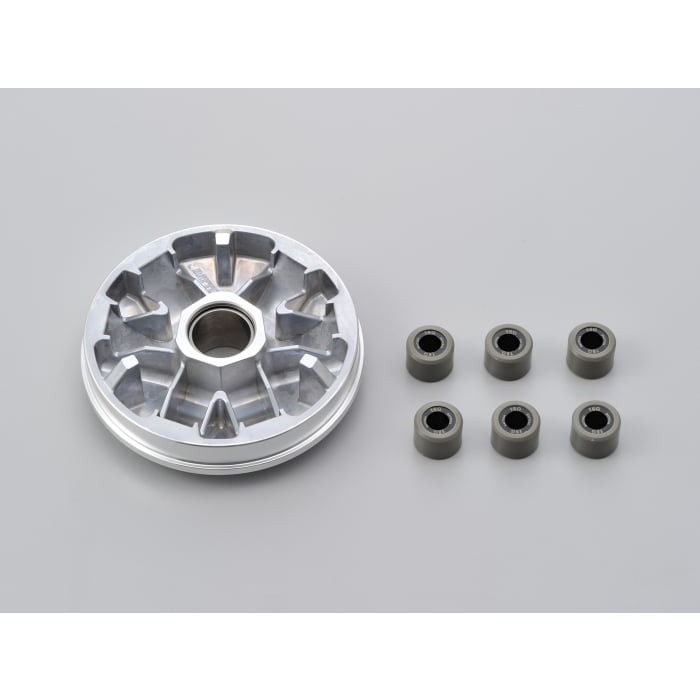 加速&最高速アップのためローラーガイド形状をとことんまで煮詰めたハイスピードプーリー。プーリーボス挿入部はドライメタルを採用。ノーマルマフラーに合わせた軽すぎないウエイトローラー16g×6個付属。
