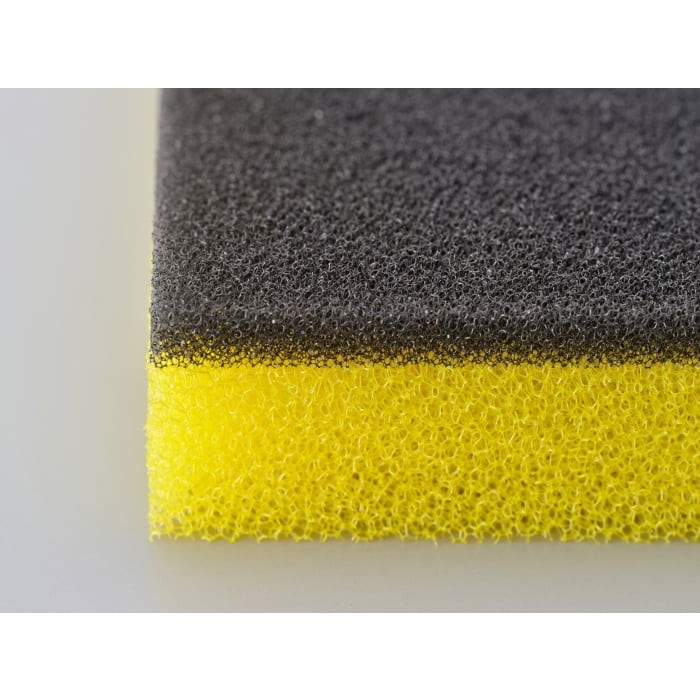 粗目(黄色面)のフィルターと細目(黒色面)のフィルターのコンビネーション(ポリウレタンフォーム素材)。標準タイプに加え、粗目タイプと極細目タイプをラインアップ。