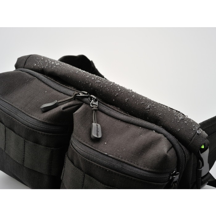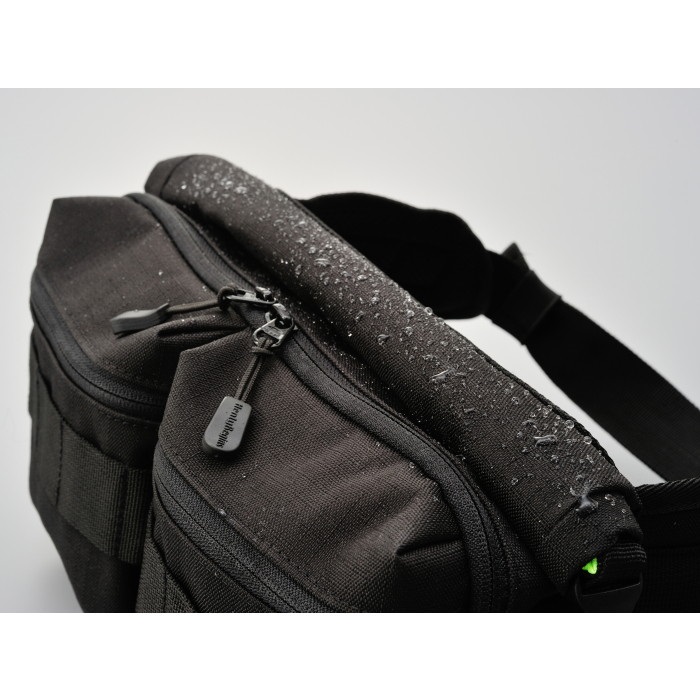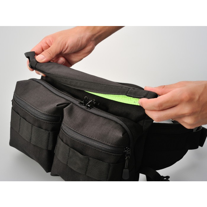 いざというときに役立つロールトップ防水気室と大小3つの非防水気室を装備したウエストバッグ。普段使いやすいように防水気室の割合を少なく設計しました。ショルダーバッグとしての使用可能です。