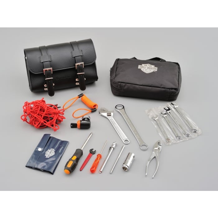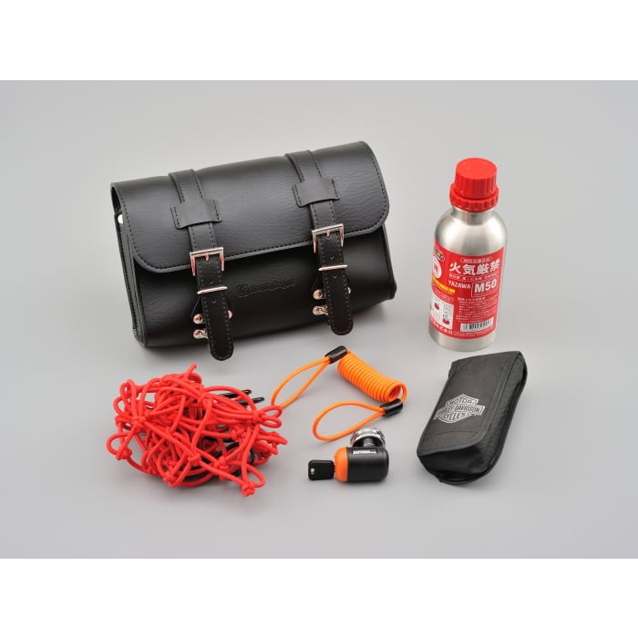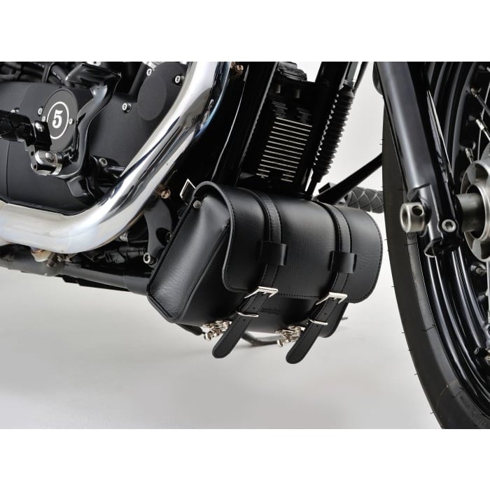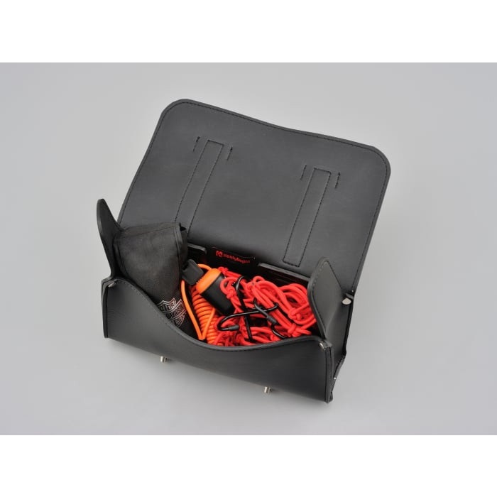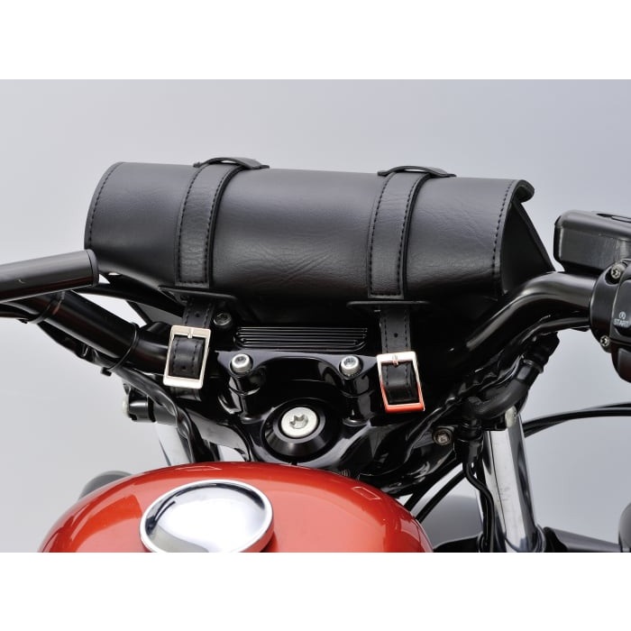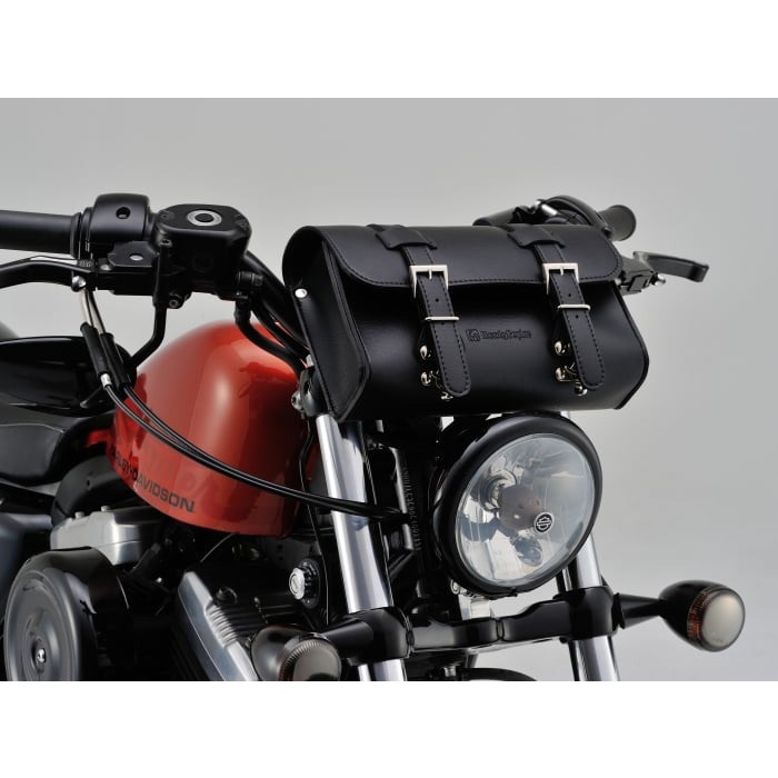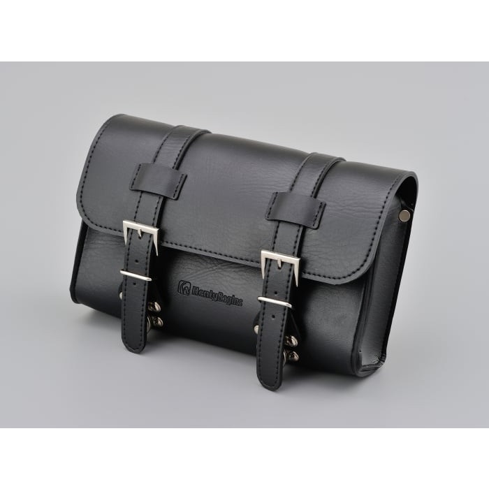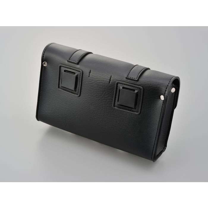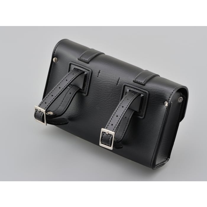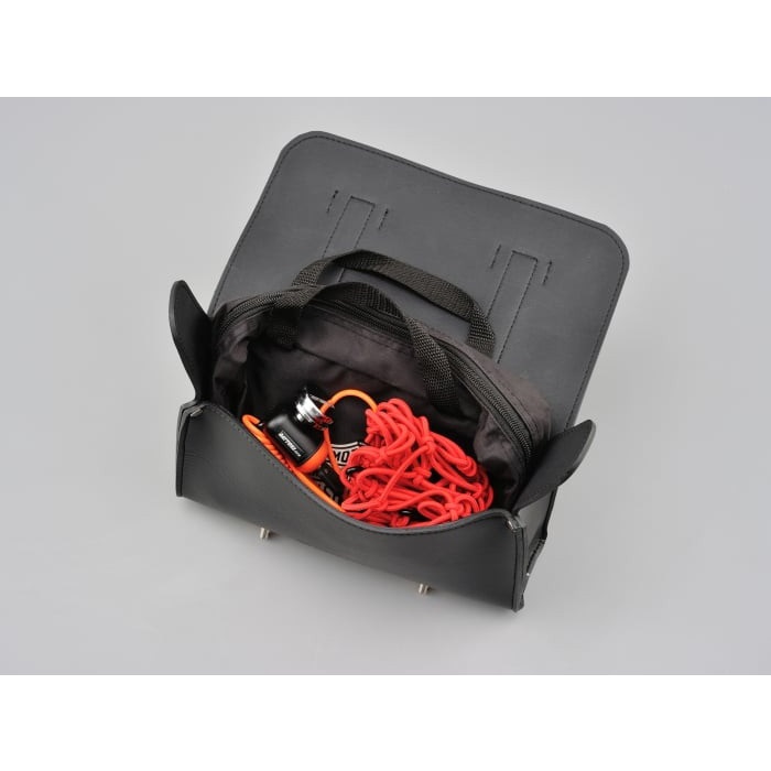 収納場所が無いハーレーや国産アメリカンなどに工具や書類を積載できるツールバッグ。固定ベルトの取り付け穴が縦・横に開いているので、ハンドルバーやダウンチューブ、シーシーバーなどにも取り付け可能です。