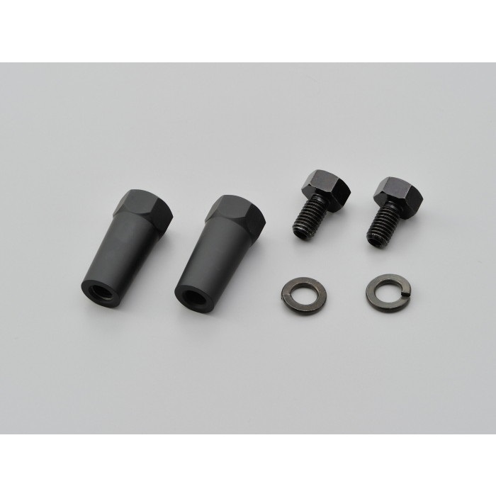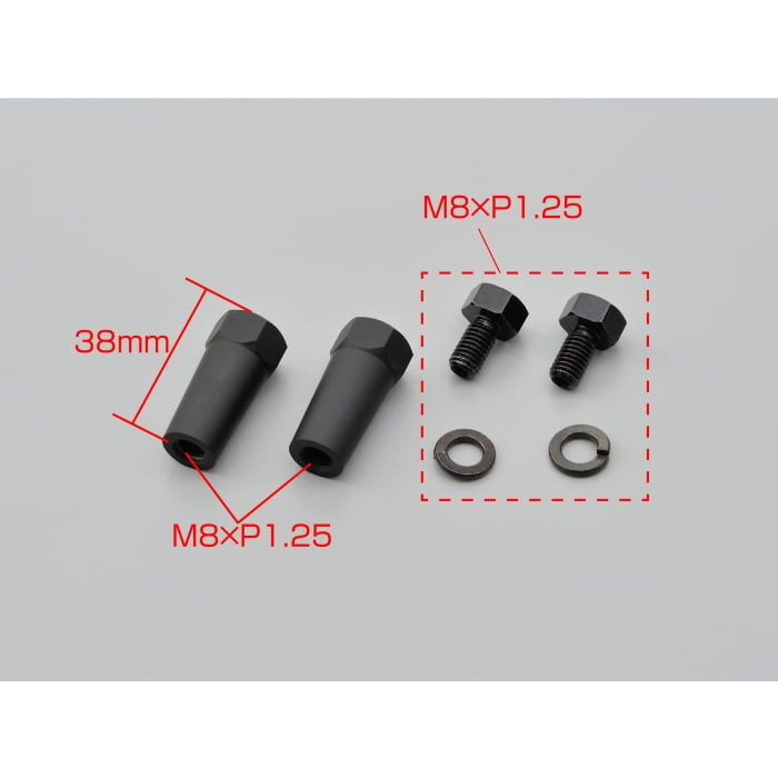 ナンバープレートにウインカー発光面が隠れる場合などに、ウインカーの取付位置を片側38mm外側に移動することができるD-Light シリーズ用のウインカーアダプター。